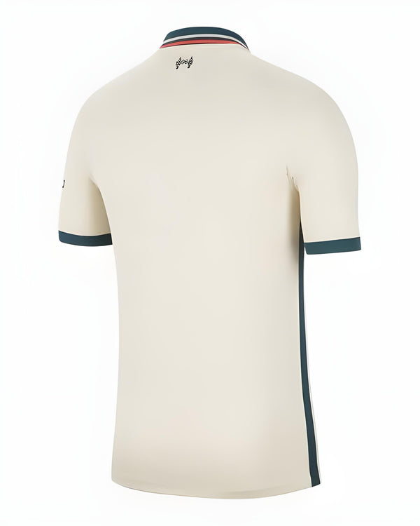 The Liverpool Away kit for the 2021/2022 season is a striking departure from tradition, introducing a bold and modern aesthetic that commands attention. The dominant color for the away jersey is a vibrant shade of teal, giving it a distinctive and energetic feel. The kit features intricate geometric patterns in a darker shade, adding depth and dynamism to the design. The sleek V-neck collar and trim showcase a minimalist yet stylish approach, emphasizing simplicity and sophistication, The Liverbird emblem, proudly emblazoned on the chest, maintains the club's identity amidst the contemporary design. The Liverpool Away kit for the 21/22 season is a fusion of innovation and tradition, offering fans and players a visually captivating and unique expression of the club's spirit.