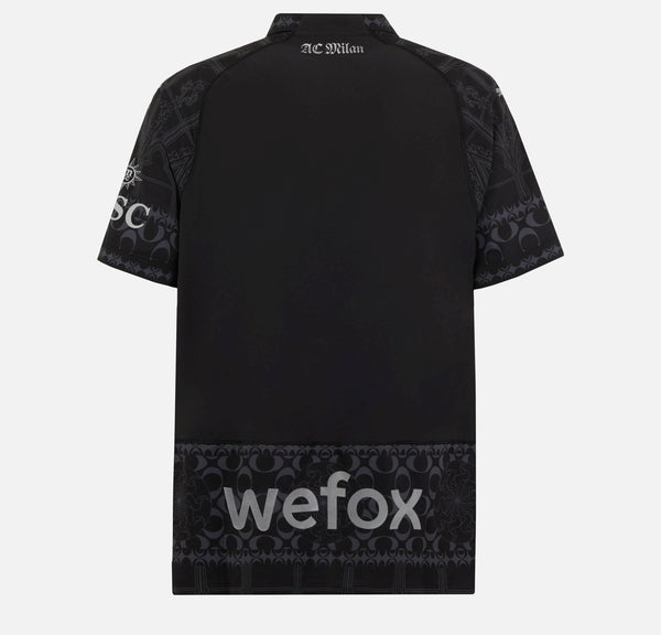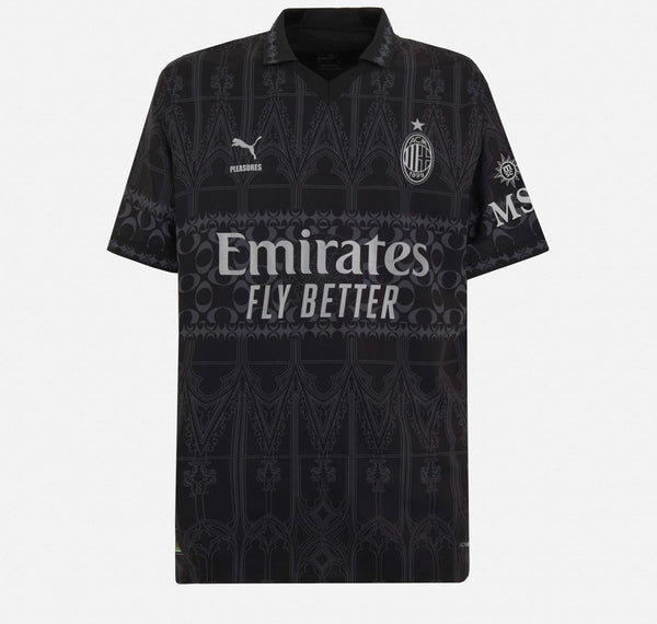 Introducing the AC MILAN X PLEASURES 23/24 Fourth Jersey - Dark Version, a fusion of football tradition and contemporary streetwear style
