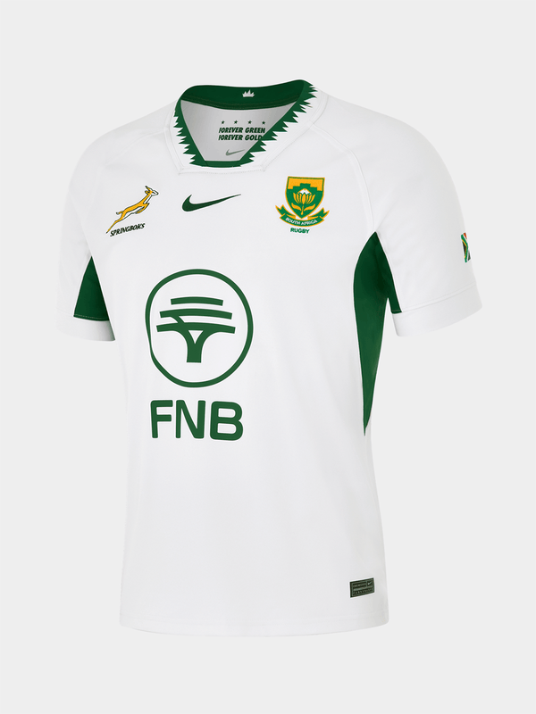 The Springboks 2025 Away jersey features a striking design that embodies the spirit of South African rugby. The jersey is predominantly a vibrant green, accented with bold gold stripes across the shoulders and sleeves, symbolizing unity and strength. Made from innovative moisture-wicking fabric, it combines comfort and performance, allowing players to move freely on the field. The official Springboks emblem is proudly displayed on the chest, representing the team's heritage and pride. Perfect for fans and players alike, this jersey captures the essence of the Springboks' fighting spirit for the 2025 season.